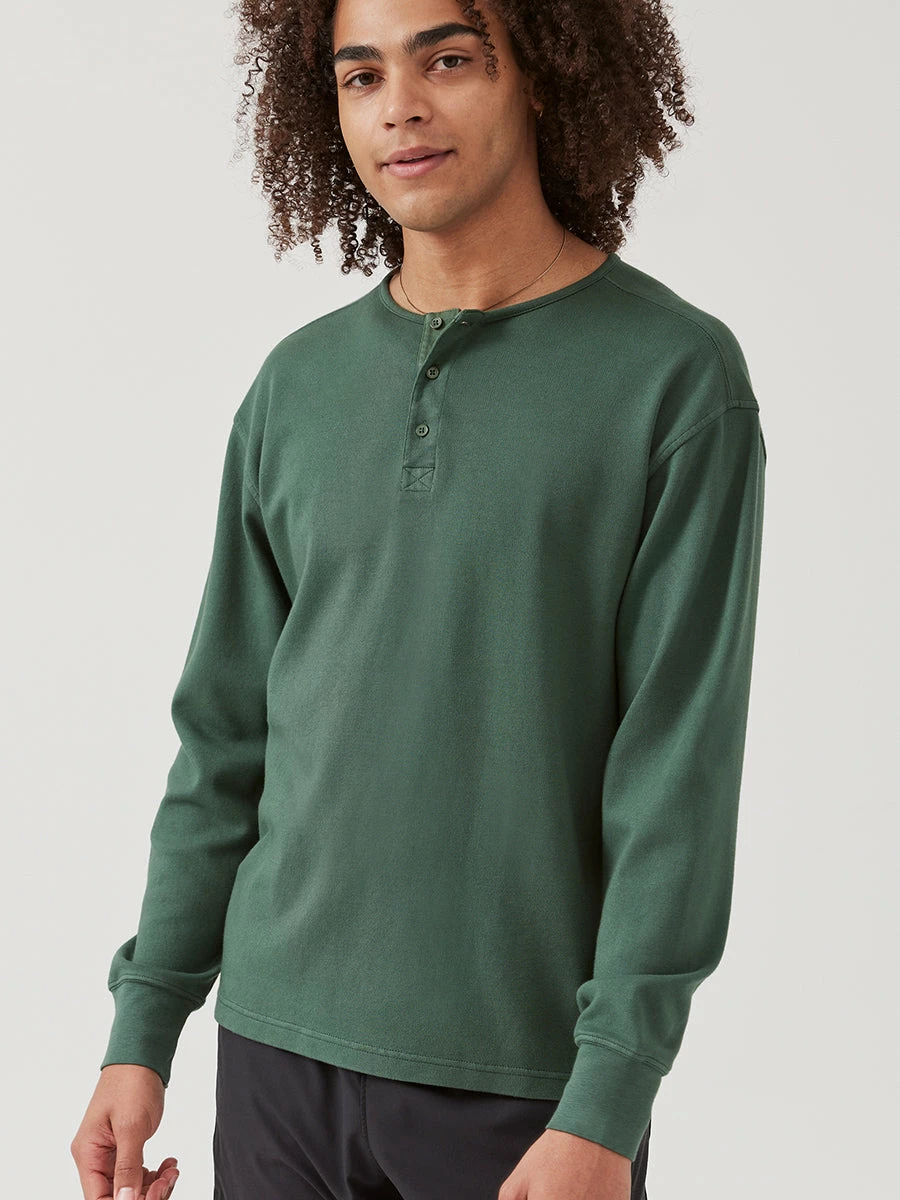 A comfortable and airy recreational classic. Made in a heavyweight 100% Organic Cotton — this soft to the touch longsleeve features a unisex fit, henley neckline, cuff sleeves, and color-matched buttons for an open or closed look.