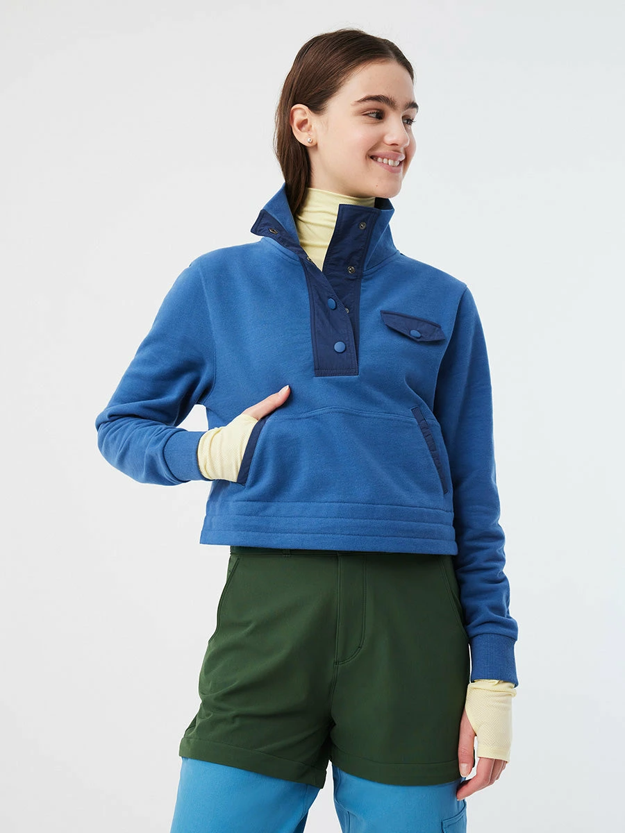 A lightweight layer designed to keep you warm while Doing Things. Made in our Soft Cotton Terry, featuring a snap-up collar, roomy kangaroo pocket, and bungees at the hem. 100% Organic Cotton. Product was formerly called Cotton Terry Snap Up.
